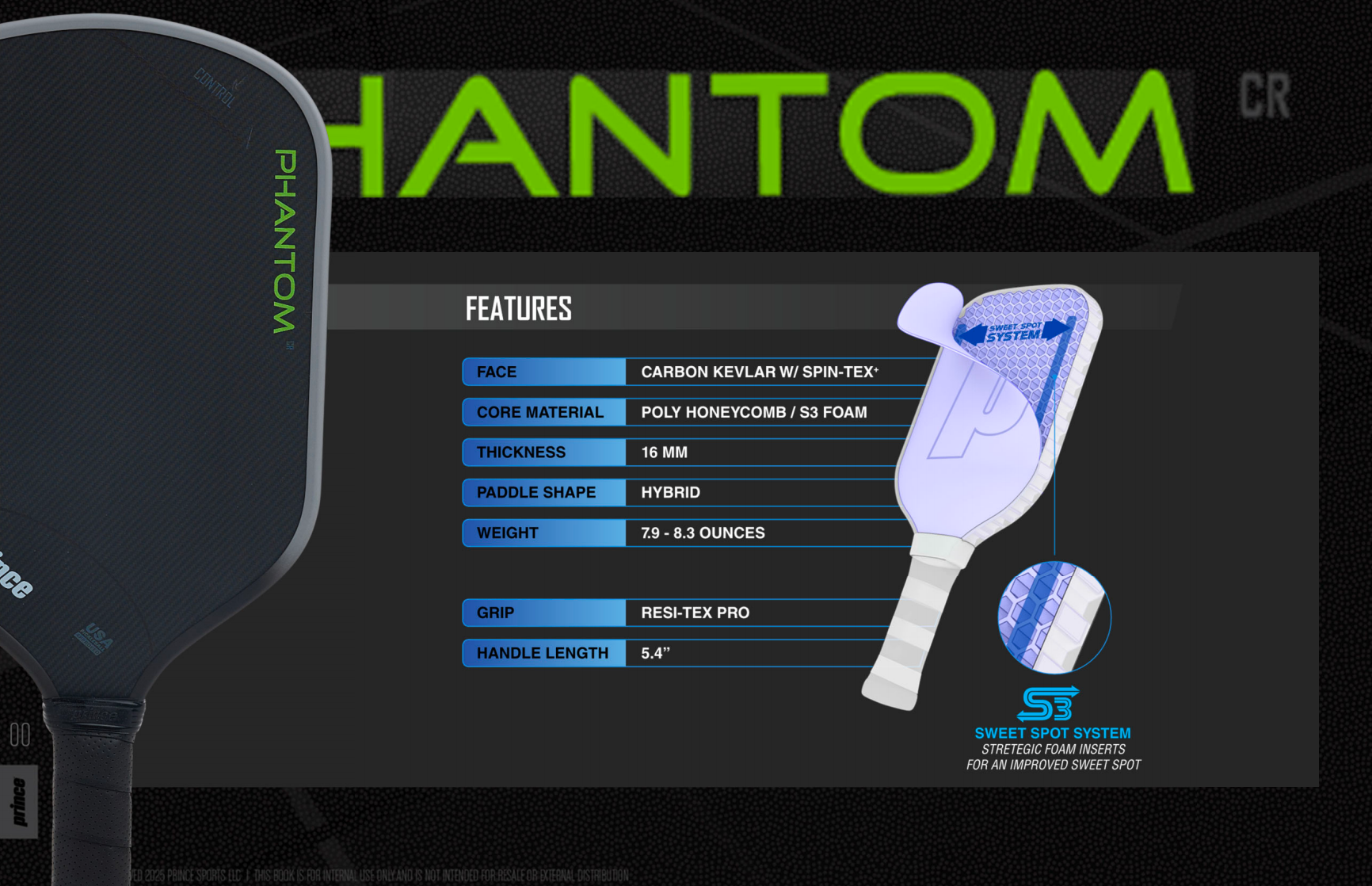 結合 10mm 聚丙烯蜂巢核心 與 碳纖維-Kevlar 拍面,Phantom 能創造出市面上無可比擬的持球感(ball pocketing)。